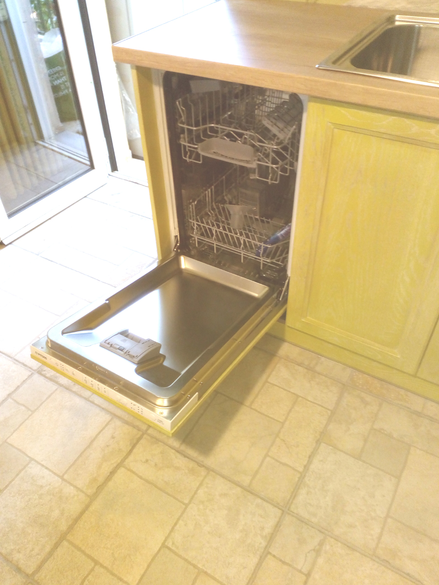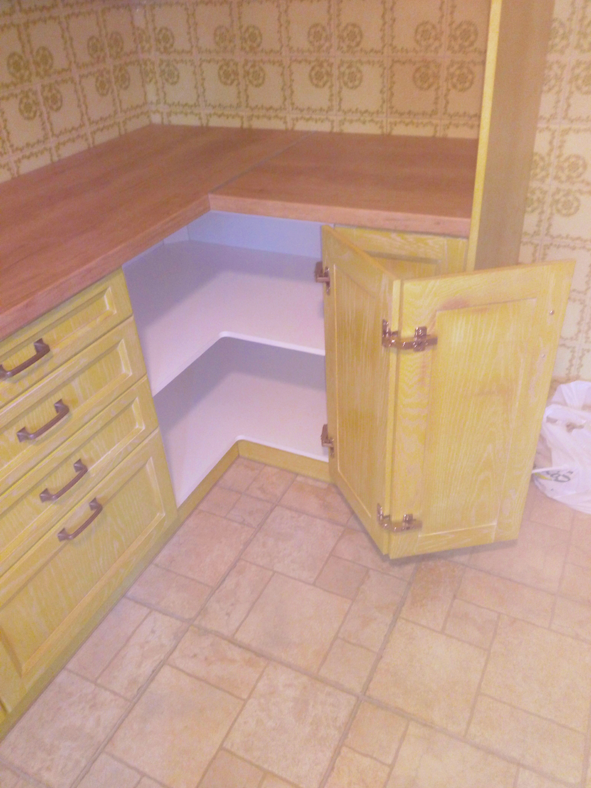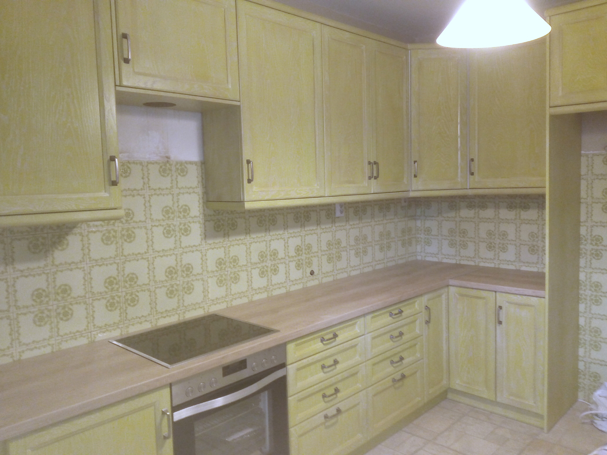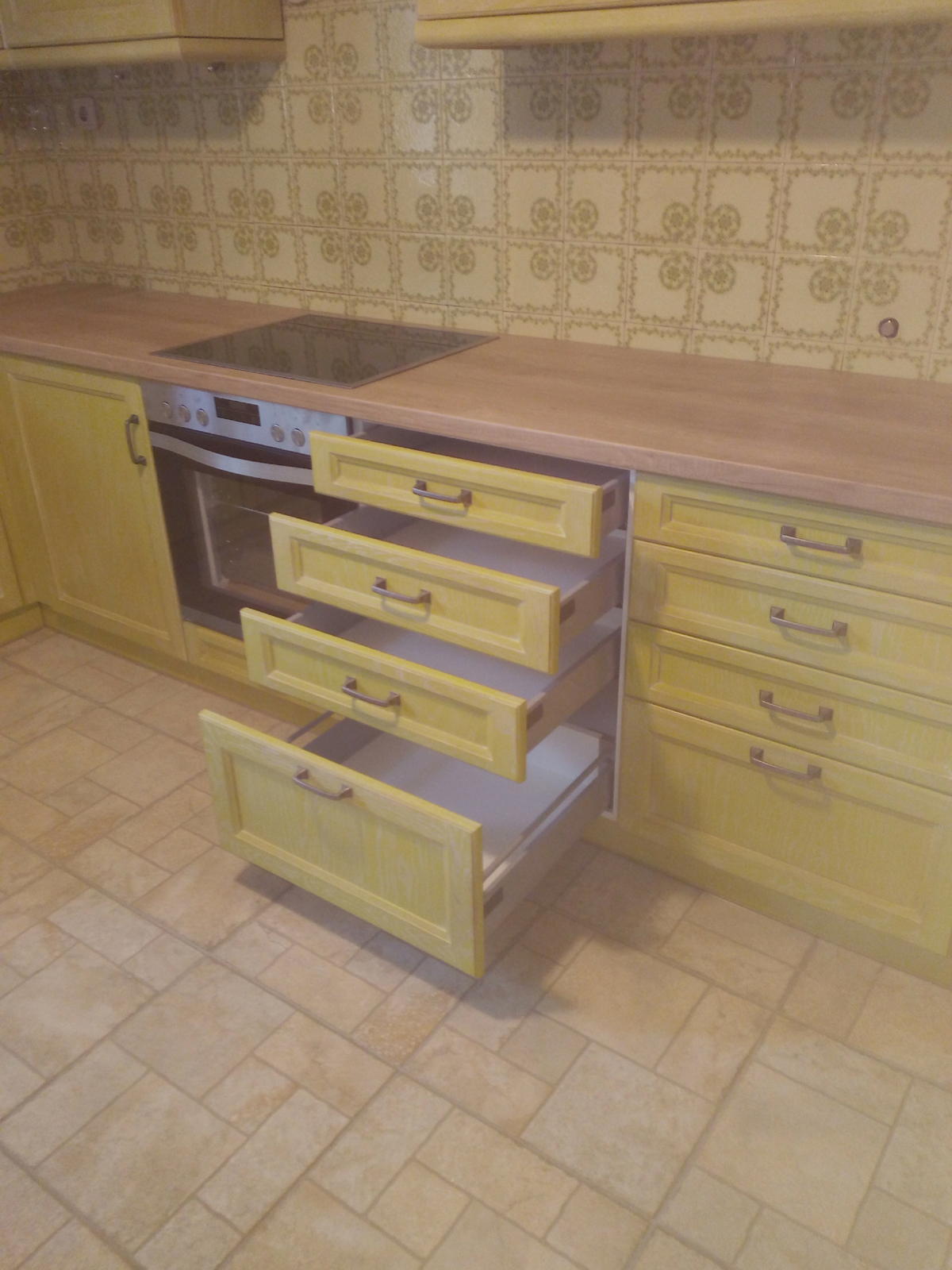 Νεοκλασική κουζίνα στον Ν. Αττικής, δρύϊνη ημιμασίφ, σε βαφή ντεκαπέ δίχρωμη σε σχήμα Πι.Σχέδιο προσόψεων 146-Ε. Τα κρεμαστά ερμάρια έχουν ύψος 96 εκ., υπάρχουν 2 συρταριέρες (με μηχανισμούς επιβράδυνσης τά συρτάρια), πλήρως εντοιχιζόμενο πλυντήριο πιάτων 45 εκ. και γωνιακό ερμάριο βάσεως με σπαστή πόρτα για πλήρη προσβασιμότητα και αξιοποίηση του χώρου.