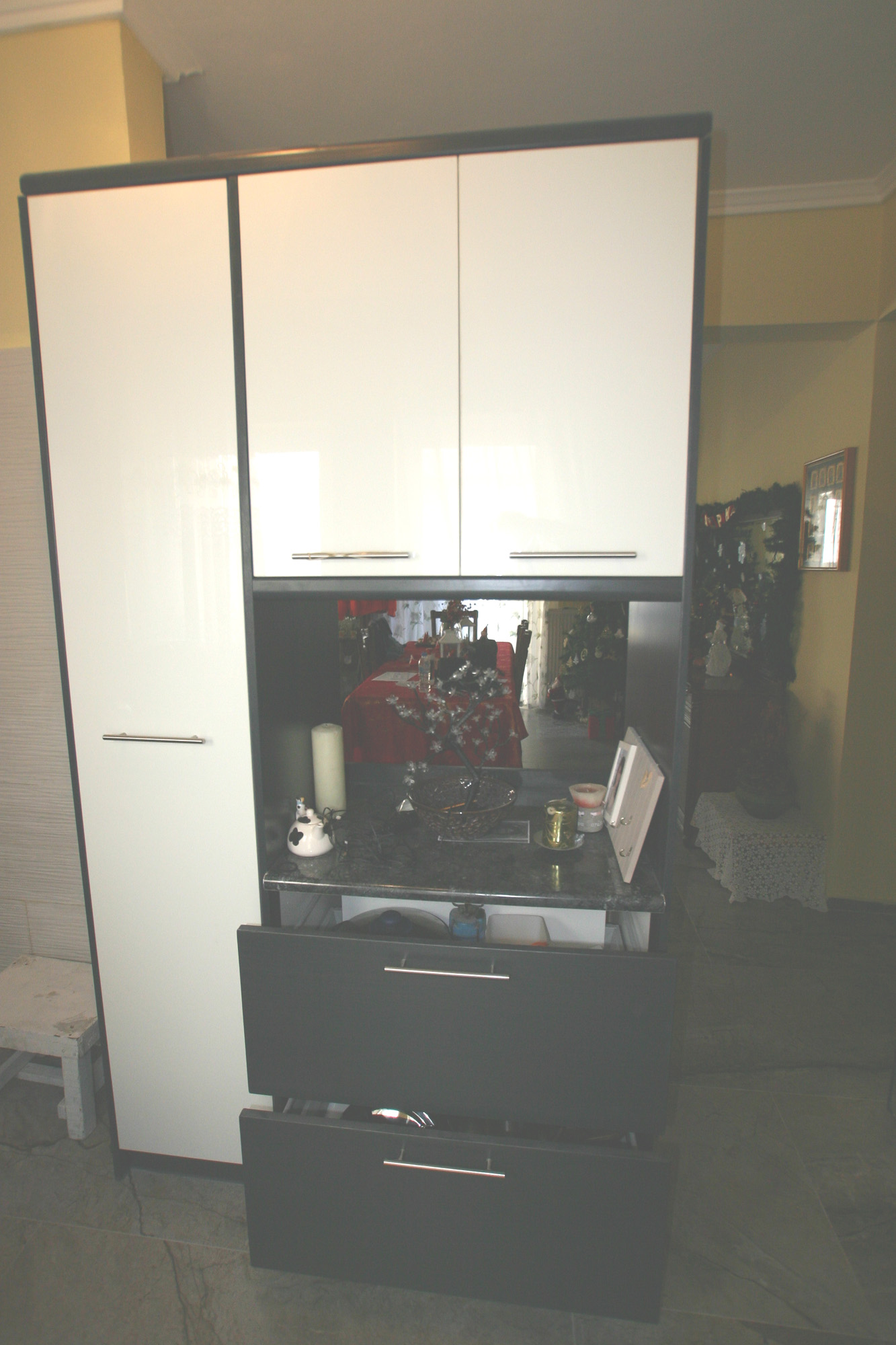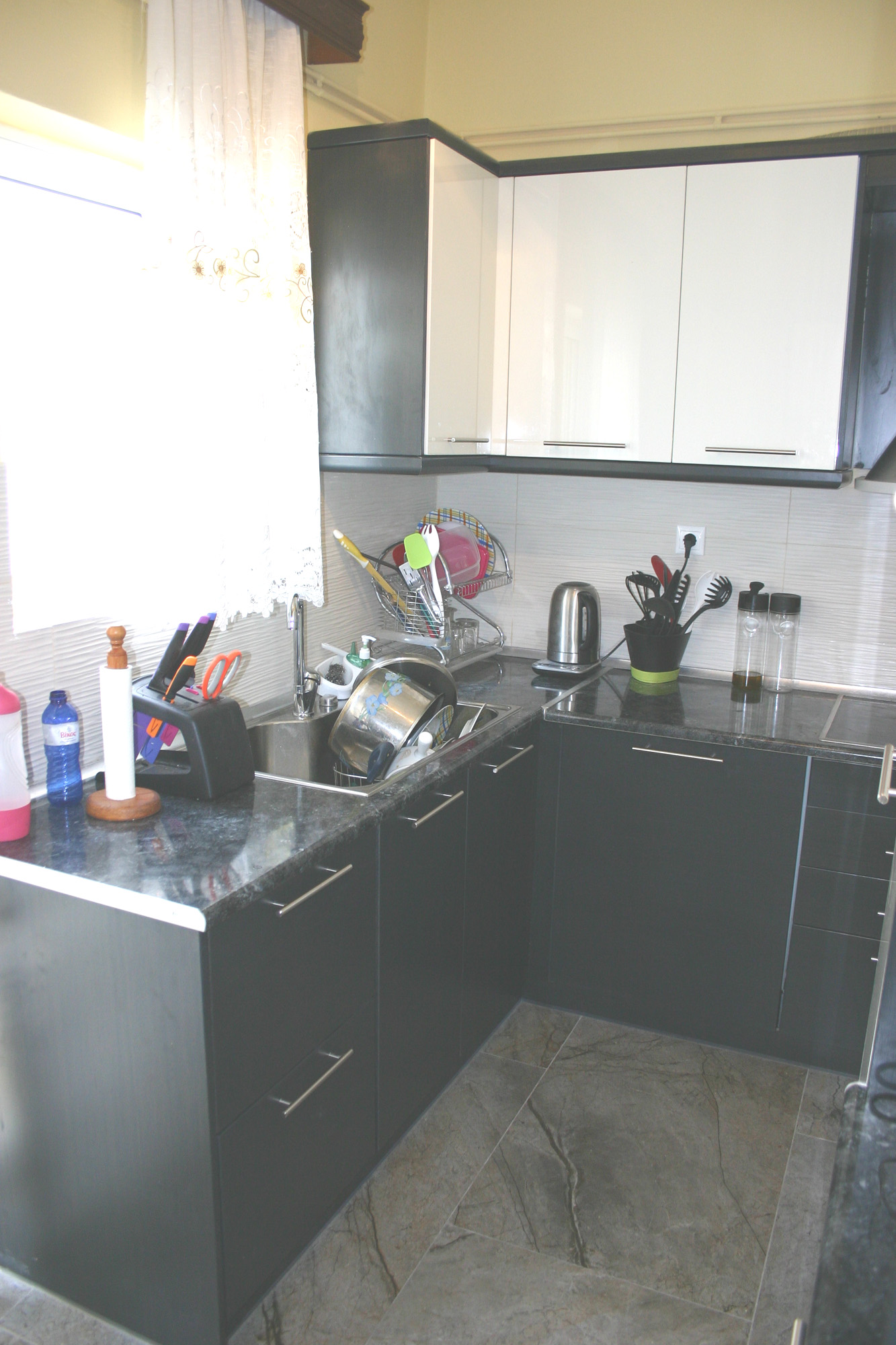 Μιά πραγματικά δύσκολη (σχεδιαστικώς) περίπτωση λόγω της ιδιομορφίας του χώρου που μας ανάγκασε νά χωρίσουμε τα έπιπλα σε τρία τμήματα. Παρ' όλα αυτά τo τελικώς επιτευχθέν αποτέλεσμα, λειτουργικώς καi αισθητικώς ήταν καλύτερο του αναμενομένου. Νεροχύτης, εστίες, απορροφητήρας-καμινάδα, πλυντήριο πιάτων, ψυγείο, συρόμενη τροφιμοθήκη, μηχανισμός γωνίας magic corner με μηχανισμό επιβράδυνσης στο κλείσιμο, μεγάλα συρτάρια και βαγονέτα, διαχωριστικό πάσο κουζίνας-σαλονιού, όλα χώρεσαν!