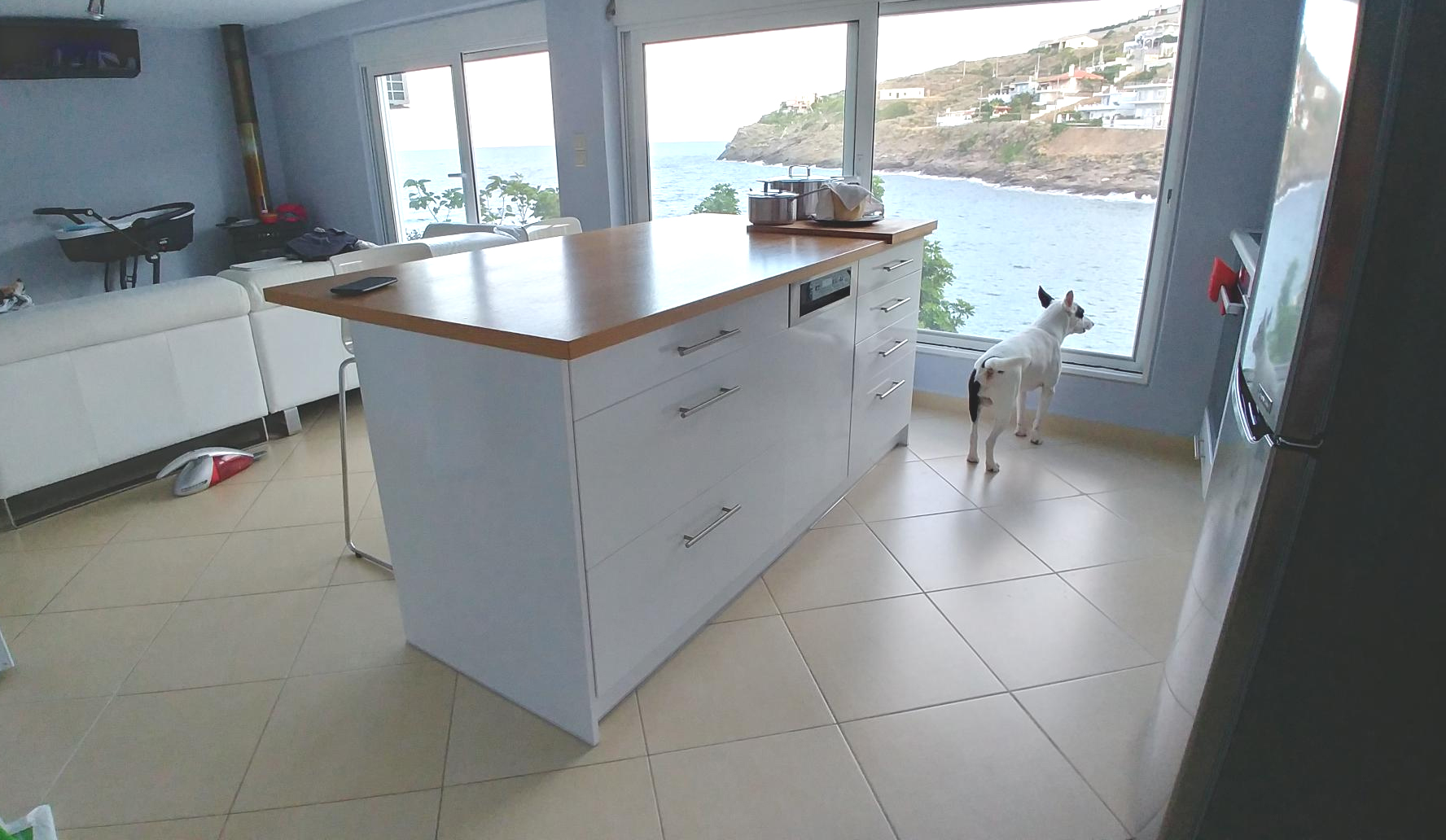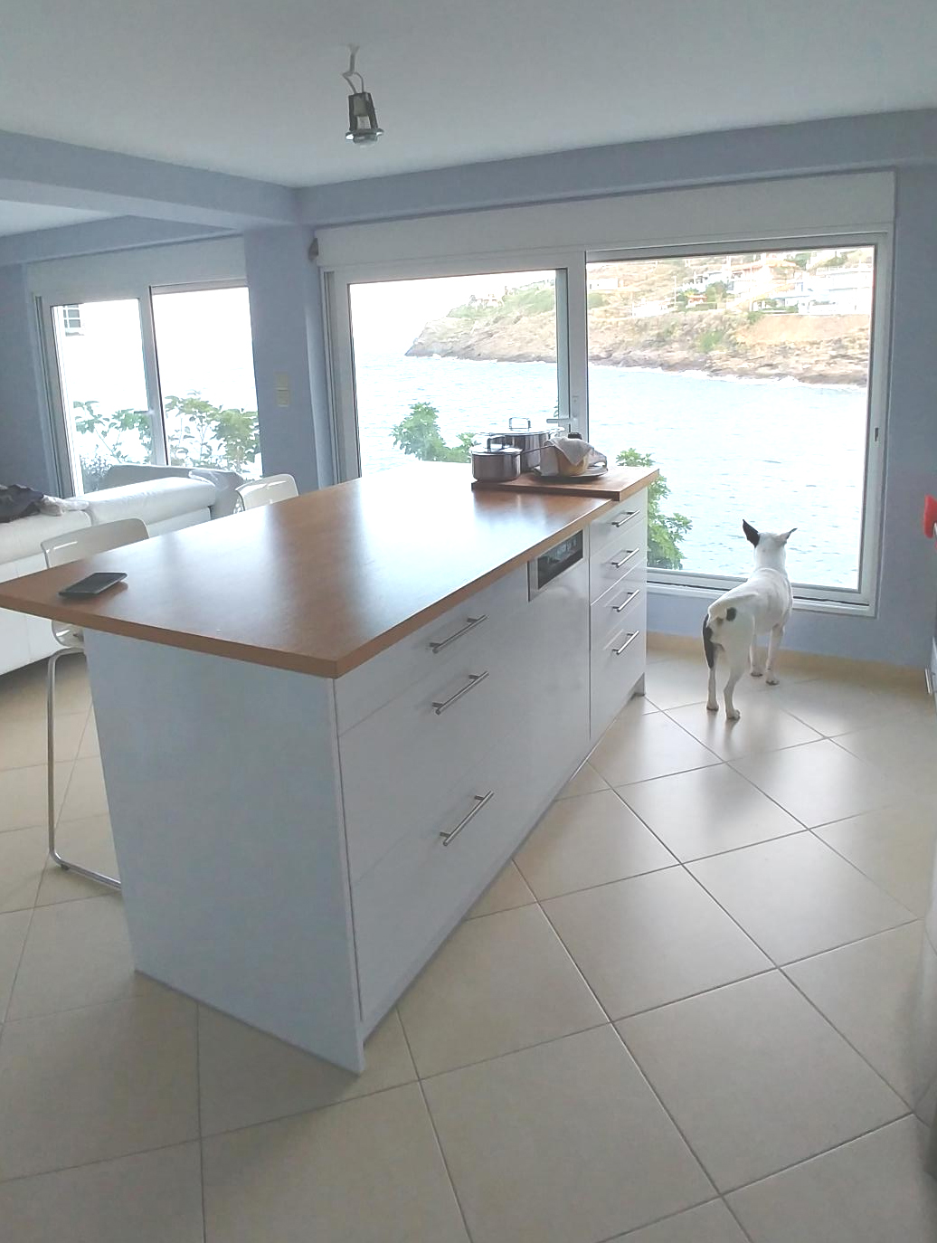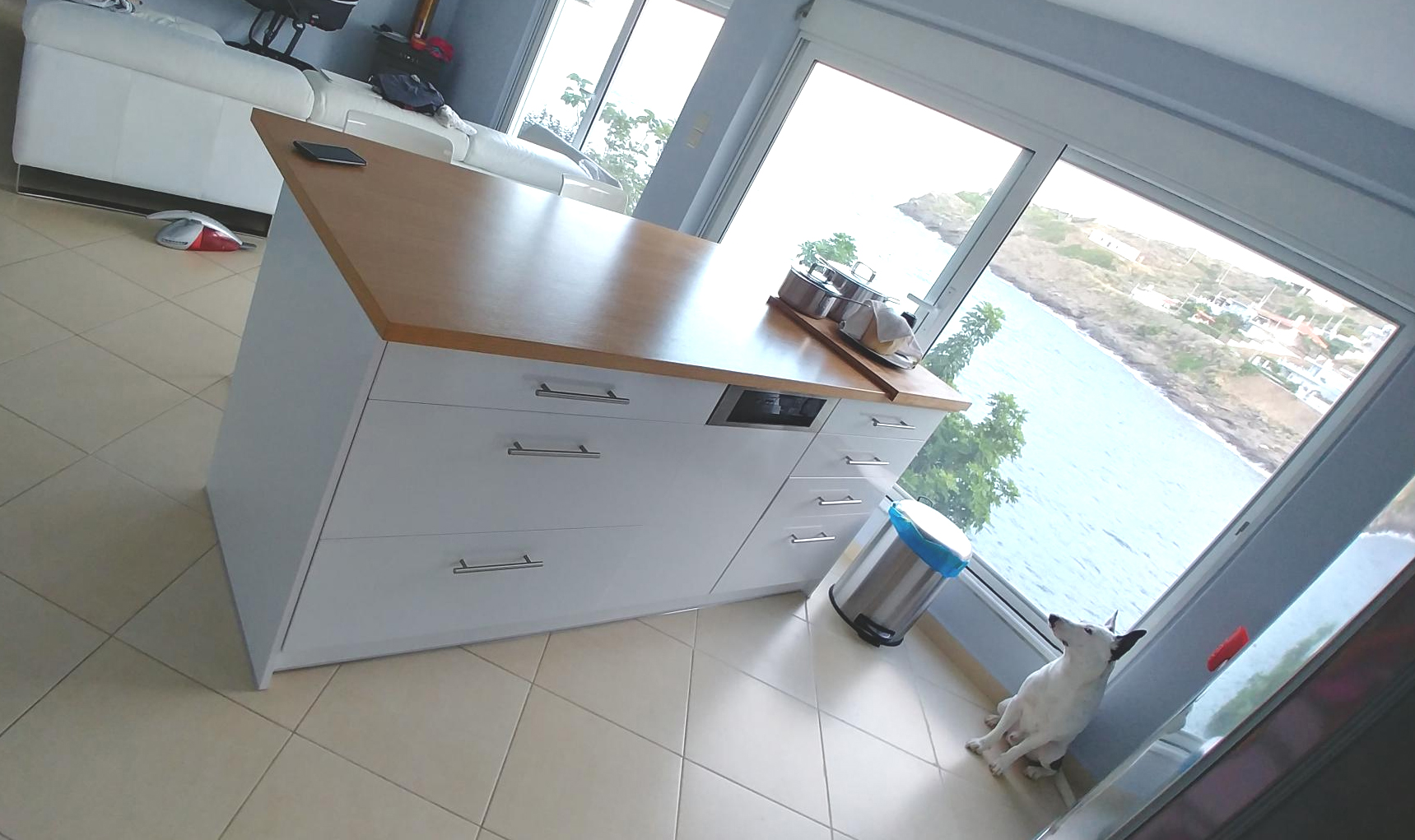 Κουζίνα μοντέρνα με υλικό πρόσοψης Pet 18 χιλ. γυαλιστερό (High Gloss) λευκό. Στο κέντρο υπάρχει νησίδα με πάγκο μεγαλύτερο που χρησιμοποιείται και ως τραπέζι φαγητού.Το χρώμα τού πάγκου αποτελεί μία αρμονική αντίθεση στο λευκό σύνολο.Συρτάρια μεγάλα με μηχανισμό επιβράδυνσης και άνωθεν του νεροχύτη ερμάριο με ανακλινόμενο μηχανισμό Blum.
