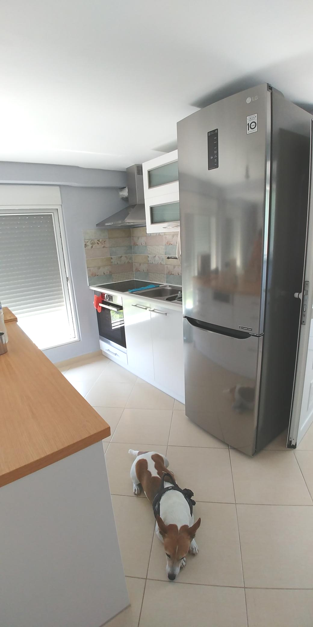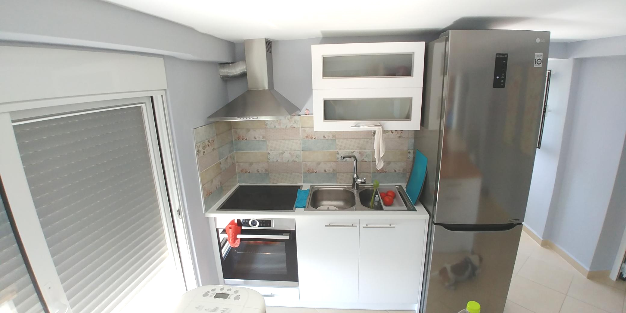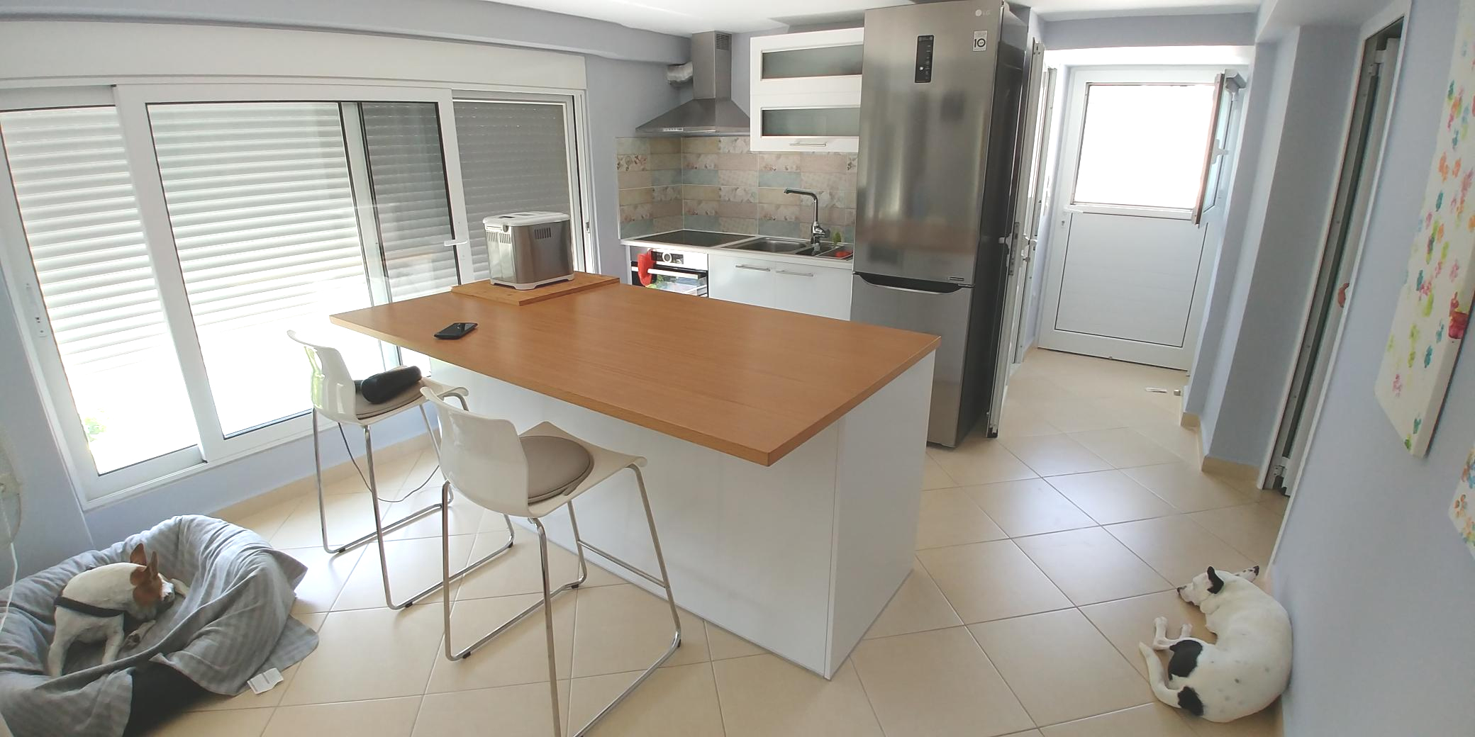 Κουζίνα μοντέρνα με υλικό πρόσοψης Pet 18 χιλ. γυαλιστερό (High Gloss) λευκό. Στο κέντρο υπάρχει νησίδα με πάγκο μεγαλύτερο που χρησιμοποιείται και ως τραπέζι φαγητού.Το χρώμα τού πάγκου αποτελεί μία αρμονική αντίθεση στο λευκό σύνολο.Συρτάρια μεγάλα με μηχανισμό επιβράδυνσης και άνωθεν του νεροχύτη ερμάριο με ανακλινόμενο μηχανισμό Blum.
