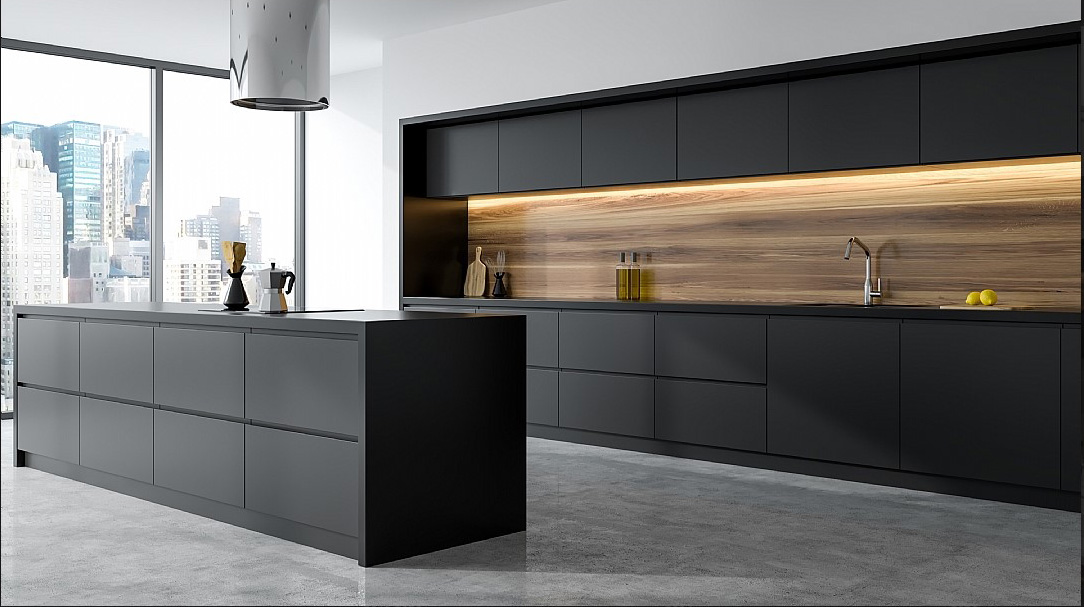 Κουζίνα μοντέρνα εντυπωσιακή, με προσόψεις από pet ματ. Εναλλακτική επιλογή (ακριβότερη) προσόψεις MDF λακαριστό-ματ σε πλειάδα αποχρώσεων.Άλλη εναλλακτική επιλογή, μελαμίνη Egger 18 χιλ. (η οικονομικώτερη επιλογή). Η ανυπαρξία λαβών (σύστημα gola) και η κυριαρχία τού ανθρακί χρώματος αναδεικνύουν την όλη σύνθεση με τρόπο θετικό.
