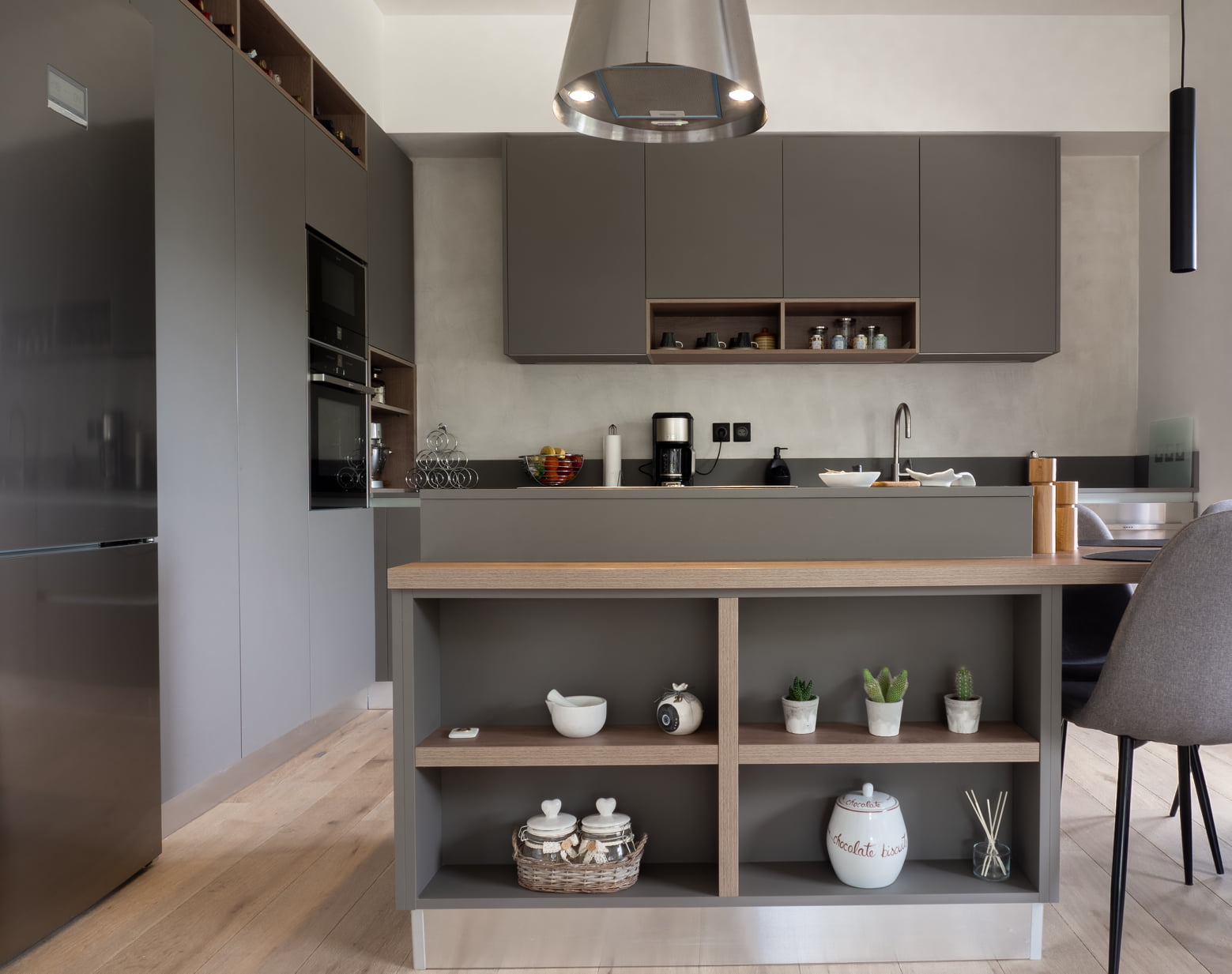 Κουζίνα μοντέρνα με προσόψεις από μελαμίνη Egger 18 χιλ. Εναλλακτική επιλογή (ακριβότερη) pet υψηλής στιλπνότητος (High Gloss). σε πλειάδα αποχρώσεων. Η διακριτική διχρωμία σέ κάποια στοιχεία καθώς επίσης και η μπάζα αλουμινίου, τονίζουν αρμονικά τό απαλό ανθρακί χρώμα τών προσόψεων. Αξίζει προσοχής η απέριττη διακοσμητική κατασκευή στο εμπρόσθιο τμήμα της νησίδος.