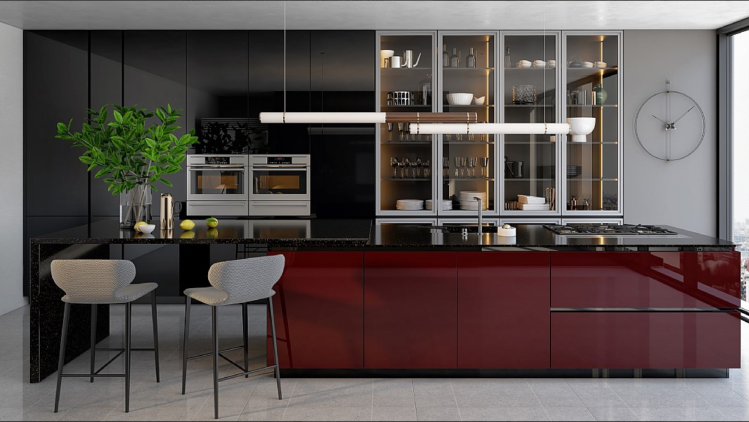 Κουζίνα μοντέρνα, πολύ εντυπωσιακή, με προσόψεις από pet υψηλής στιλπνότητος (High Gloss). σε πλειάδα αποχρώσεων. Οι βιτρίνες αλουμινίου, η διχρωμία κοκκίνου-μαύρου αναδεικνύουν την όλη σύνθεση με τρόπο θετικό.