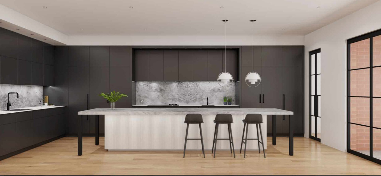 Κουζίνα μοντέρνα, εξαιρετικώς μεγάλη καί εντυπωσιακή με προσόψεις από μελαμίνη Egger 18 χιλ. Εναλλακτική επιλογή (ακριβότερη) pet υψηλής στιλπνότητος (High Gloss). σε πλειάδα αποχρώσεων. Το κύριο ανθρακί χρώμα, η μεγάλη νησίδα, οι μαύρες λαβές, η διχρωμία καθώς επίσης και ο λευκός πάγκος, αναδεικνύουν την όλη σύνθεση με τρόπο θετικό.